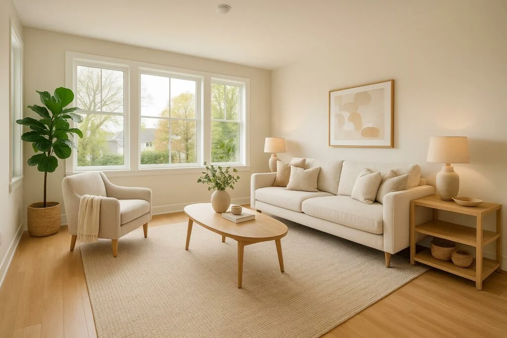 • Her odanın tamamını gösteren net kadrajlar (köşeden çekim, mobilyaları dengeli yerleştirme)
